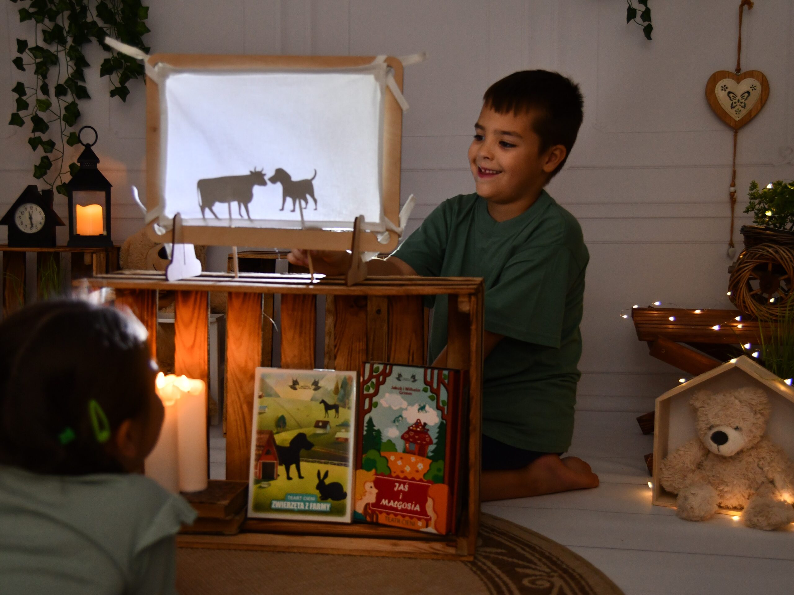 dzięki którym każda postać może „ożyć” na ekranie teatru cieni. Dzieci mogą odgrywać scenki inspirowane życiem na farmie albo tworzyć własne, pełne humoru i przygód opowieści – o kaczce, która szuka stawu, o ciekawskim kogucie czy o krótkiej wyprawie krówki na łąkę.